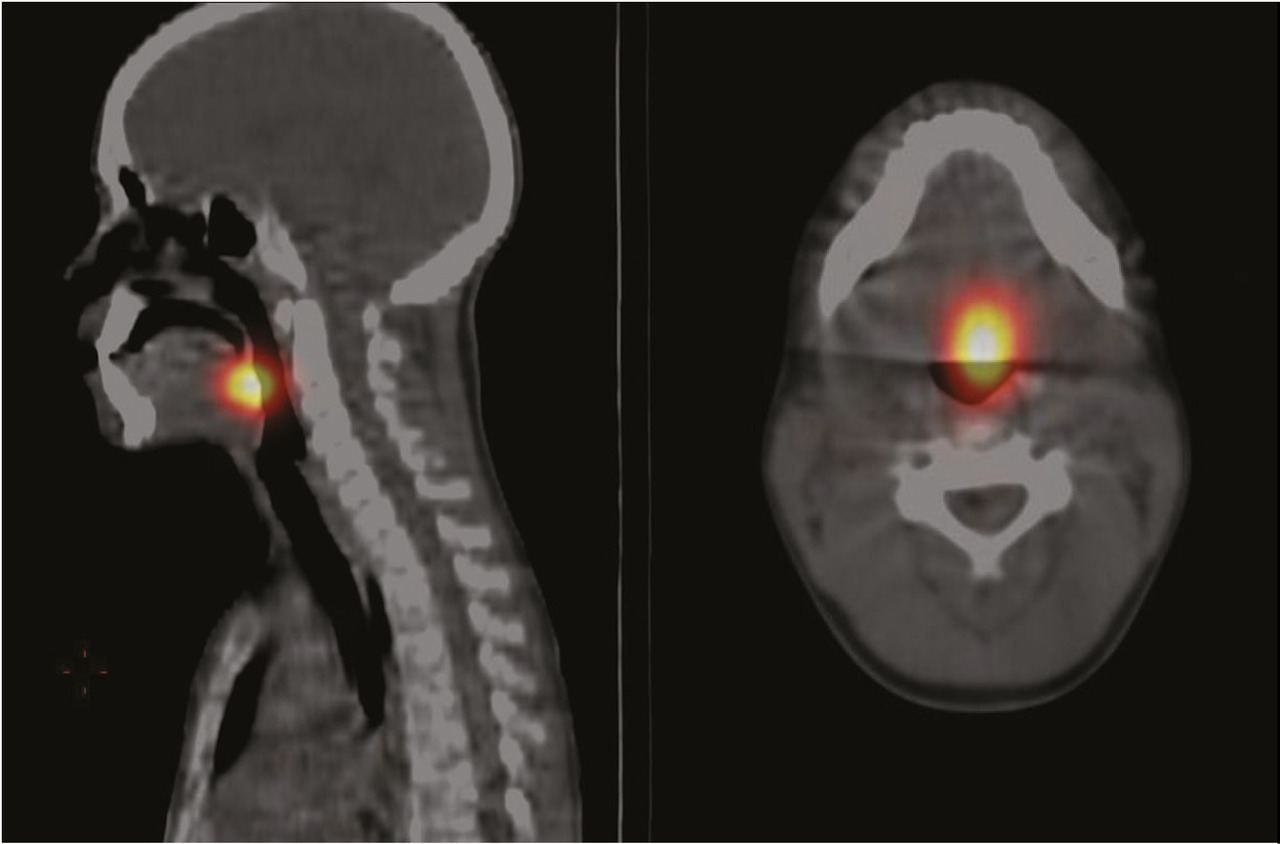 Ce jeune garçon de 12 ans consultait pour une masse sous-mentonnière ferme et mobile. L’échographie montrait un nodule hétérogène mesurant 25 x 20 mm. Une résection chirurgicale était effectuée et l’examen histopathologique révélait un carcinome papillaire de la thyroïde. Une irathérapie à l’iode 131 était faite, suivie d’un balayage du corps entier qui mettait en évidence un résidu iodofixant cervical haut de siège basi-lingual sur la tomographie par émission de positons couplée à la tomodensitométrie (TEP/TDM) (fig. 1A et B]. L’évolution était favorable avec l’obtention d’une carte blanche isotopique et d’un taux indétectable de thyroglobuline sur le bilan d’efficacité thérapeutique.