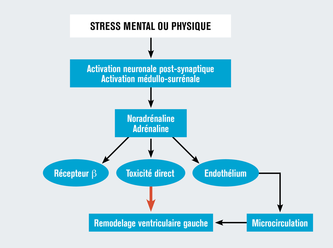 Non encore totalement élucidée, il a été évoqué un infarctus myocardique avorté par rupture de plaque non visible ou thrombus spontanément lysé, un spasme diffus des vaisseaux coronaires ou une dysfonction de la microcirculation. Il existe, en revanche, des arguments solides pour évoquer la responsabilité de la sécrétion de catécholamines secondaire à la survenue d’un stress physique ou mental. Il s’ensuit une activation neuronale post-synaptique et médullo-surrénale avec sécrétion de noradrénaline et d’adrénaline qui agissent sur les bêtarécepteurs adrénergiques mais aussi par toxicité directe et action sur l’endothélium de la microcirculation coronaire, ces deux derniers phénomènes contribuant au remodelage ventriculaire gauche (fig. 2 ). La localisation apicale de la ballonisation du ventricule serait en rapport avec une répartition inhomogène des récepteurs β1 et β2 myocardiques entre la base et l’apex du ventricule gauche.