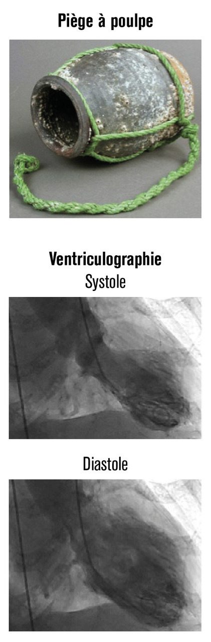 Parfois aussi appelée cardiomyopathie de stress ou syndrome de ballonisation apicale transitoire du ventricule gauche, la cardiomyopathie de Takotsubo se caractérise par une dysfonction aiguë transitoire et une déformation ventriculaire gauche à type de ballonisation apicale associée à un sus-décalage du segment ST à l’électrocardiogramme et à une élévation modérée de la troponine sans anomalie notable à la coronarographie. Rapportée pour la première fois par l’équipe du Massachussetts Hospital en 1986,1 la cardiomyopathie de Takotsubo a été individualisée à propos de cinq cas par H. Sato en 1991.2 Il a comparé la déformation ventriculaire gauche à un takotsubo, piège à poulpe utilisé par les pêcheurs japonais (fig. 1 ). Il serait donc plus juste de parler de cardiomyopathie en forme de takotsubo.