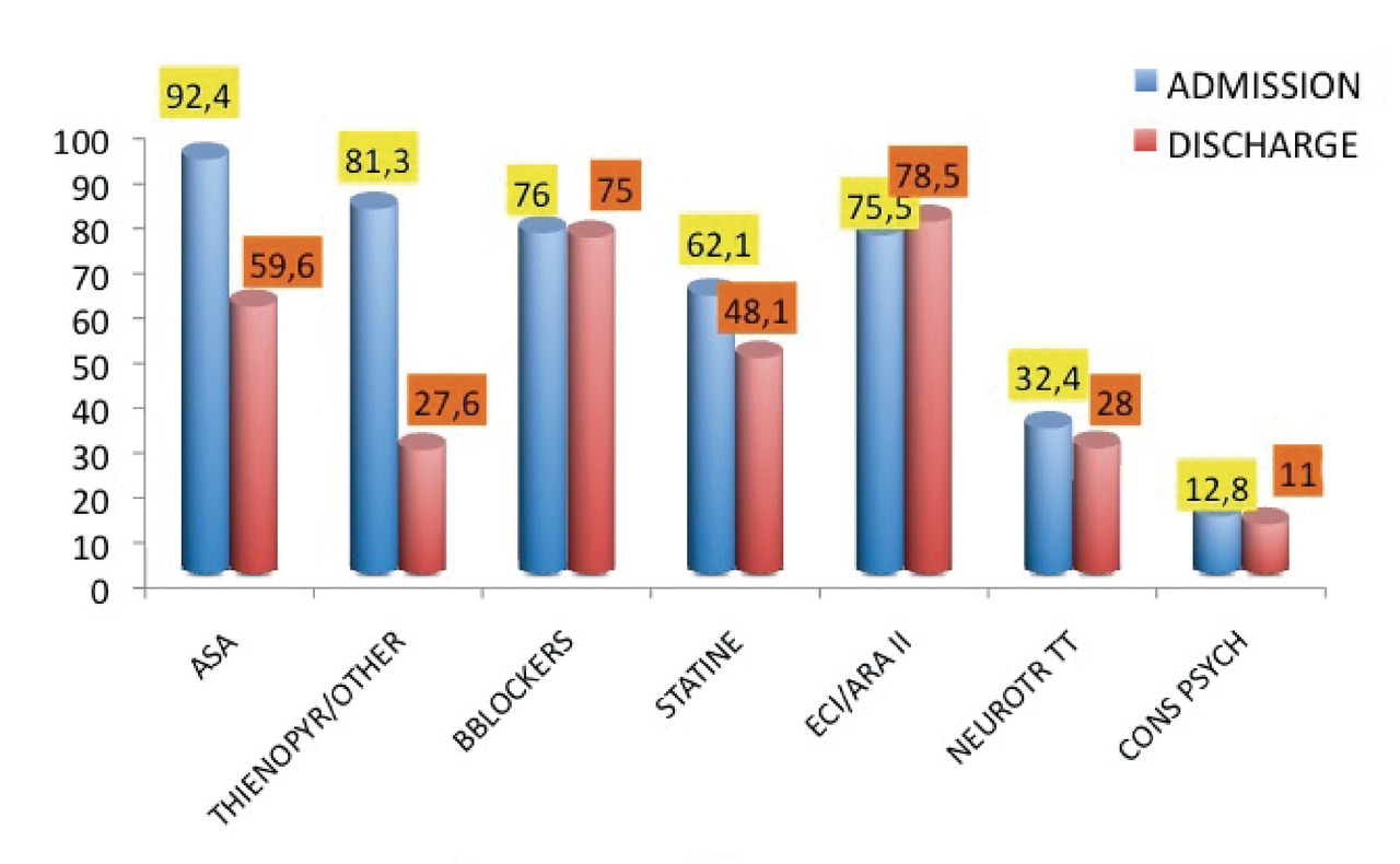 Avec le registre OFSETT,5 nous avons repris les traitements médicamenteux prescrits à l’admission et à la sortie de l’hôpital (fig. 4 ). Il montre une similitude de prise en charge initiale avec l’infarctus du myocarde associant aspirine, thiénopyridine, bêta-bloquant, statines et inhibiteurs de l’enzyme de conversion (IEC) ou antagonistes des récepteurs de l’angiotensine II (ARA II). À la sortie, le diagnostic confirmé, sont diminués l’aspirine et les autres antiagrégants plaquettaires, à un moindre degré les statines, alors que sont maintenus sans changement les bêtabloquant et les IEC/ARA II, correspondant donc à la prise en compte de l’absence de risque coronaire et de la dilatation ventriculaire gauche. Le traitement médical peut aussi comporter des médicaments spécifiques d’une complication.
