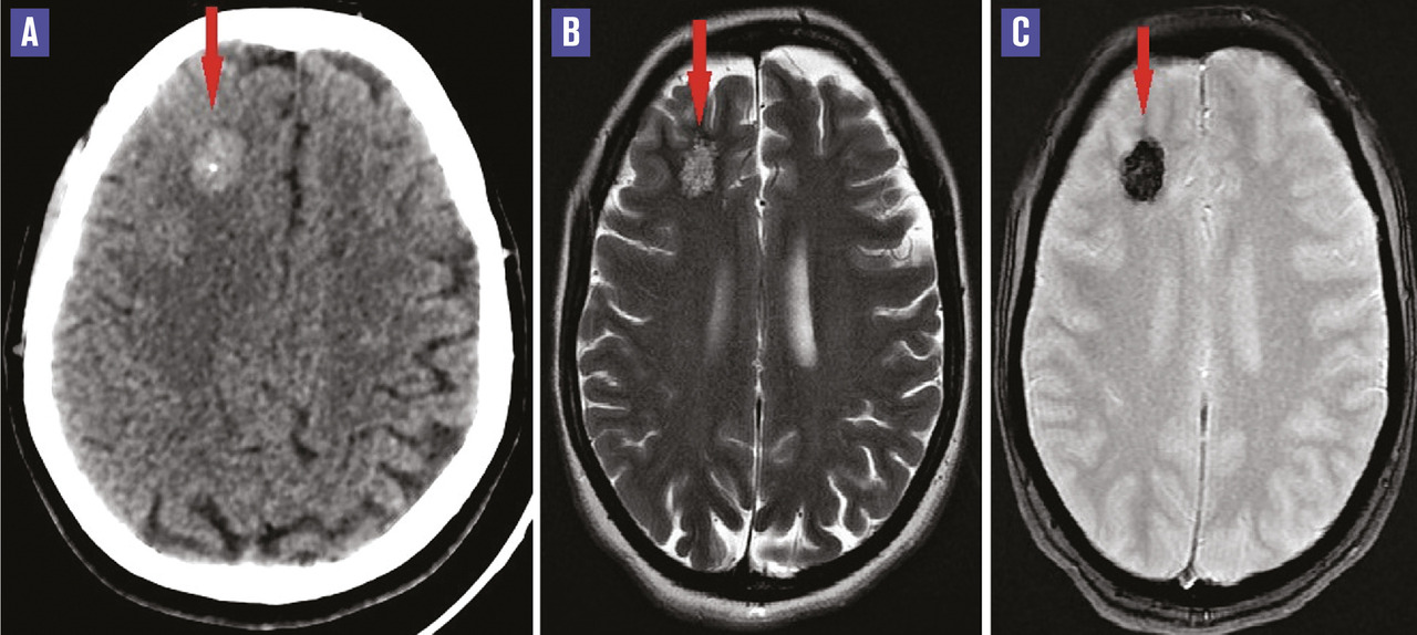 Cette femme de 43 ans, sans antécédent particulier, consultait aux urgences pour une crise convulsive tonico-clonique généralisée. À l’examen clinique post-critique, la patiente était consciente et stable. La tomodensitométrie (TDM) cérébrale montrait une lésion frontale juxtacorticale droite, spontanément dense contenant une calcification et non rehaussée après injection de contraste (fig. A ). Sur l’imagerie par résonance magnétique (IRM), la lésion apparaissait en hypersignal hétérogène contenant quelques hyposignaux sur les séquences pondérées T2 et T1, avec un hyposignal hétérogène sur la séquence T2* réalisant l’aspect en « pop-corn » (fig. B et C ). Devant le contexte clinique et cet aspect en « pop-corn », le diagnostic de cavernome frontal droit a été retenu. La patiente a été mise sous traitement symptomatique, avec persistance de quelques rares épisodes convulsifs.