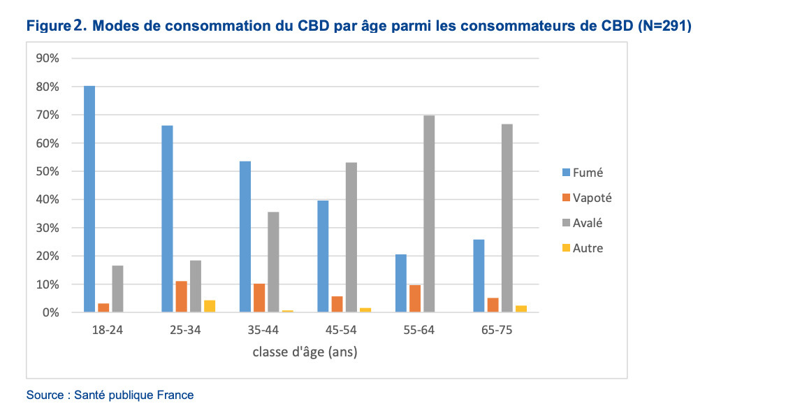 Les modes de consommation diffèrent selon l’âge : les jeunes consomment majoritairement le CBD en le fumant, alors que les plus âgés le consomment plutôt par voie orale (fig. 2), suggérant des motivations différentes d’utilisation du produit – une alternative au joint « classique » versus un usage plutôt à visée « bien-être » voire autothérapeutique.
