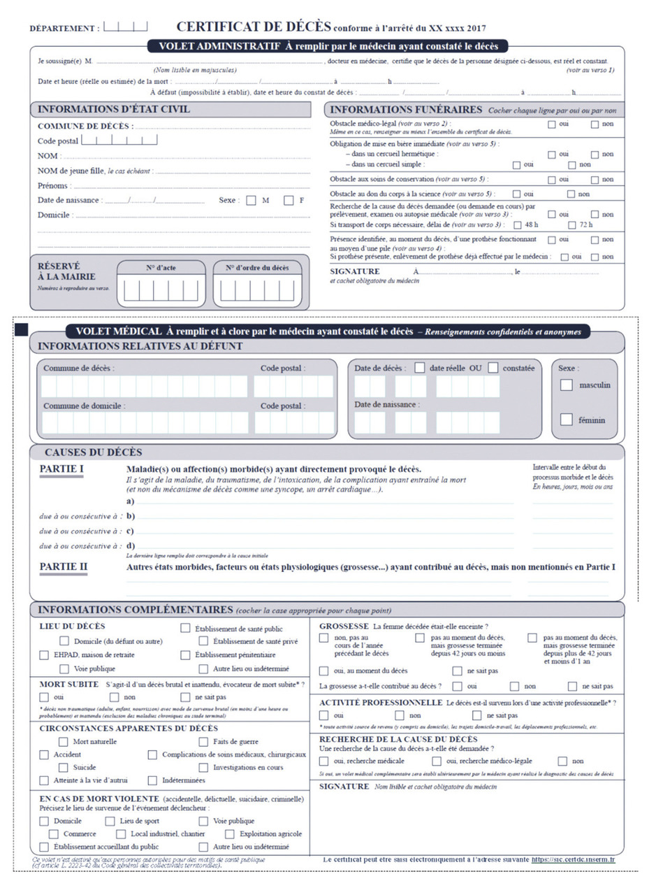 L’arrêté du 17 juillet 2017 relatif aux deux modèles du certificat de décès conserve la distinction entre le certificat de décès néonatal (fig. 3) [v. encadré] et le certificat de décès classique, mais les remanie notablement. Ils sont disponibles depuis le 1er janvier 2018 auprès des agences régionales de santé.