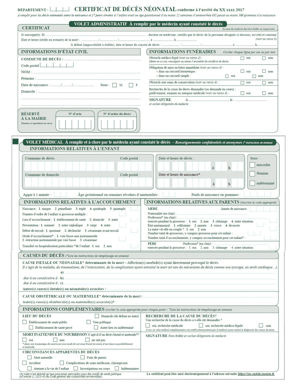 Concernant le volet médical du certificat de décès néonatal, il faut donner des informations relatives à l’enfant (poids de naissance, score d’Apgar à une minute et âge gestationnel en nombre de semaines révolues en prenant la meilleure estimation connue) à l’accouchement, ainsi que des informations anonymes relatives à la mère et au père. Les causes du décès sont à indiquer en distinguant les causes fœtales ou néonatales (par exemple des anomalies congénitales, une prématurité ou une post-maturité), des causes obstétricales ou maternelles (par exemple des anomalies du cordon, des complications de l’accouchement).