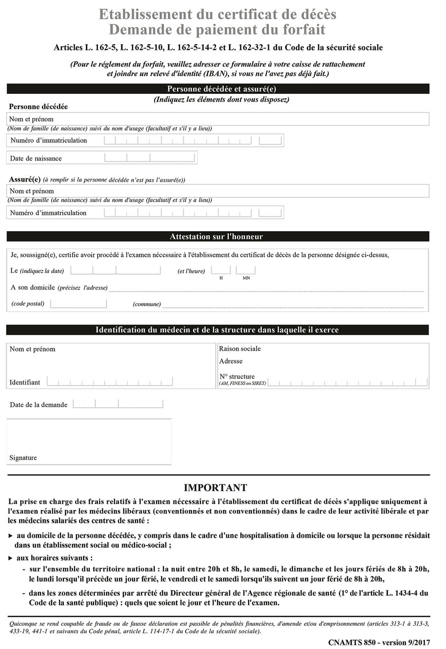 Constater cliniquement la mort et en attester le caractère réel et constant est un préalable indispensable à toute opération funéraire dont la responsabilité incombe au médecin. Tout docteur en médecine peut être amené à constater un décès, il est donc important de connaître la marche à suivre. Désormais, un forfait de 100 €, fixé par un arrêté du 10 mai 2017, est prévu pour les médecins dans le cadre de la permanence des soins.1 Ce forfait rémunère la visite et les frais de déplacements, quels qu’ils soient. Il est versé par la Caisse primaire d’assurance maladie (CPAM) de rattachement (formulaire Cerfa à transmettre à la CPAM [fig. 1]).
