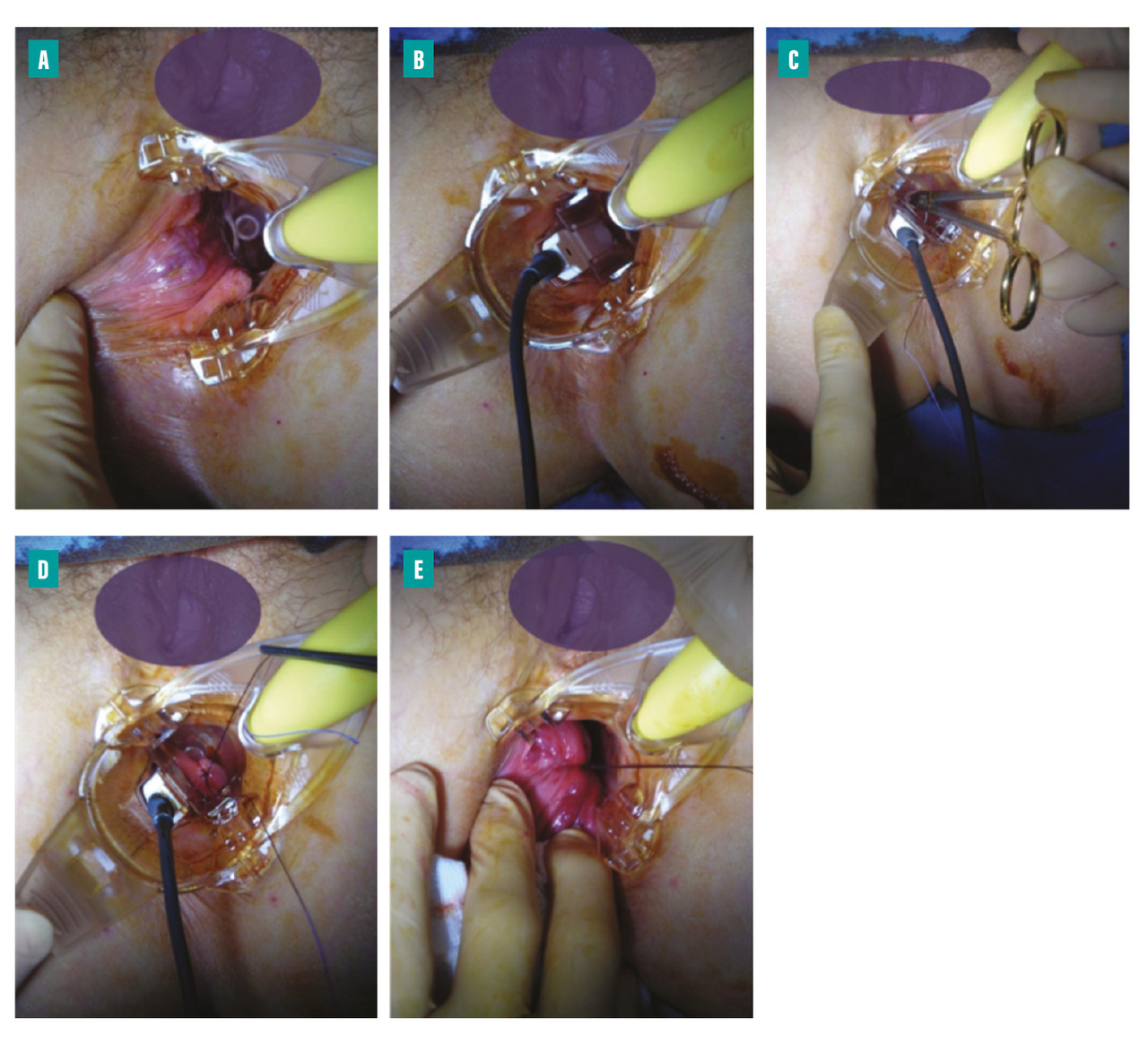 Du fait de ces écueils, et poussées par l’innovation technologique qui a concerné toute la chirurgie digestive, sont apparues depuis les années 1990 des techniques chirurgicales mini-invasives visant à traiter les symptômes de la maladie hémorroïdaire sans résection radicale des hémorroïdes. Il s’agit de l’hémorroïdopexie consistant à réintégrer les hémorroïdes par résection d’une collerette muqueuse du bas rectum inventée par Antonio Longo (fig. 2 ), de la sclérose, puis la ligature des artères hémorroïdaires sous guidage Doppler de Daniel Jaspersen, puis Kazumasa Morinaga, pouvant être associées à une plicature muqueuse selon Carlo Tagariello (HAL Doppler), de la coagulation hémorroïdaire sous-muqueuse par radiofréquence de Pravin Gupta ou au laser de Ahmet Fatin Karahaliloğlu.