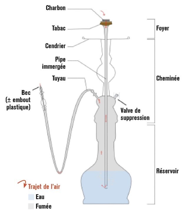 Les substances inhalées sont les mêmes que celles contenues dans la fumée des cigarettes, mais les taux de nicotine, de goudron et de monoxyde de carbone (CO) sont plus élevés. La combustion plus douce du narguilé génère plus de monoxyde de carbone (taux de CO expiré mesuré par le CO-testeur) que la cigarette.