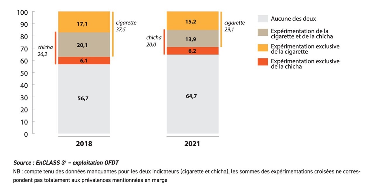 Cependant, malgré ce recul, la chicha semble jouir d’une image plus positive que la cigarette chez les jeunes, et les expérimentations exclusives se stabilisent aux alentours de 6 % entre 2018 et 2021 (fig. 2).3 Ainsi, l’usage de la chicha pourrait devenir un mode supplétif à la consommation de cigarettes de tabac pour une part notable des jeunes.
