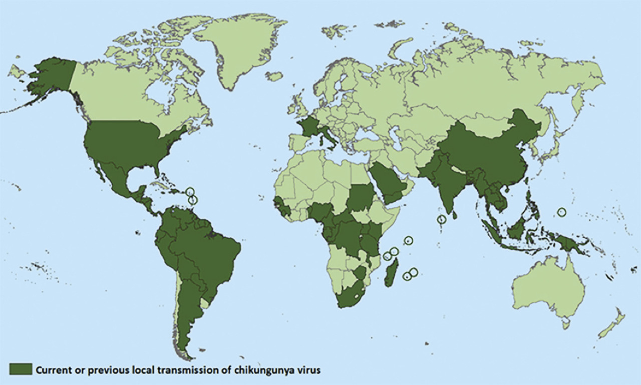 Le chikungunya, alphavirus arthrotrope transmis par la piqûre des moustiques Aedes spp., a infecté en 14 ans plus de 10 millions de personnes sur tous les continents : océan Indien (2004-2006), Asie du Sud-Est (endémo- épidémique), Pacifique (2011-2014), Amérique (depuis 2013) et Europe (circulation occasionnelle depuis 2007)1 [