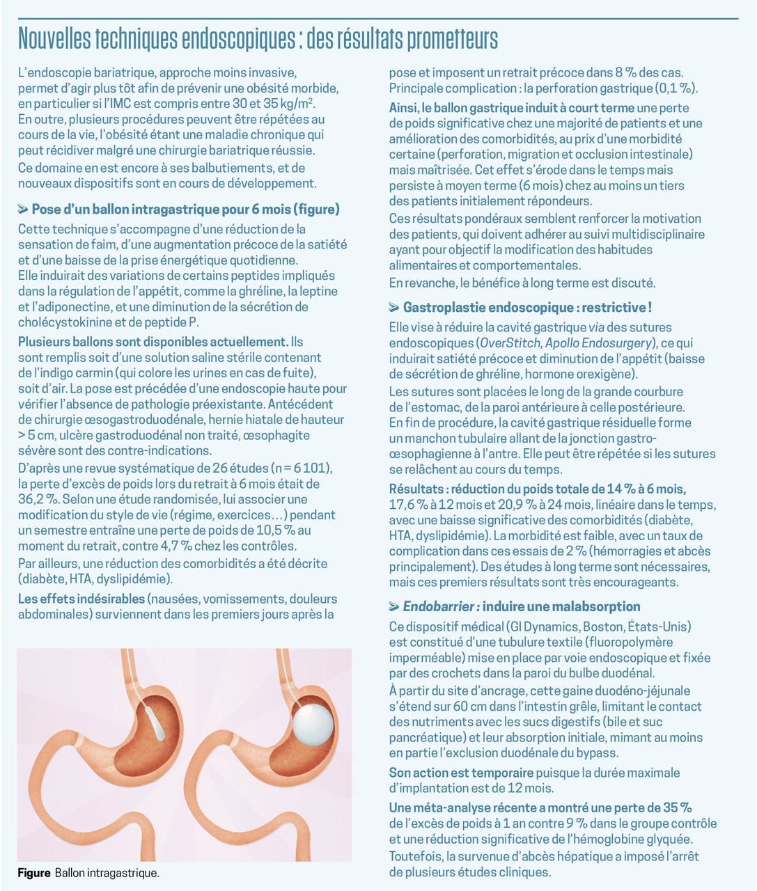 Bypass en oméga (mini-bypass) et Single Anasto- mosis Duodeno-Ileal bypass (SADI) sont en cours d’étude. Enfin, aucun traitement endoscopique n’est recommandé actuellement, y compris la pose d’un ballon intragastrique, dont les résultats sont comparables à ceux de la prise en charge médicale classique (