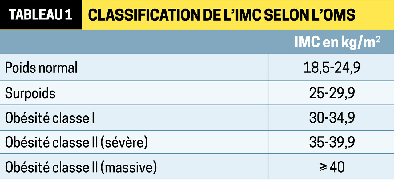 L’obésité, reconnue comme maladie par l’OMS depuis 1998, est définie comme un excès de masse grasse ayant un effet délétère sur la santé. L’indice de masse corporelle (IMC) est un outil anthropométrique simple pour caractériser l’excès pondéral (