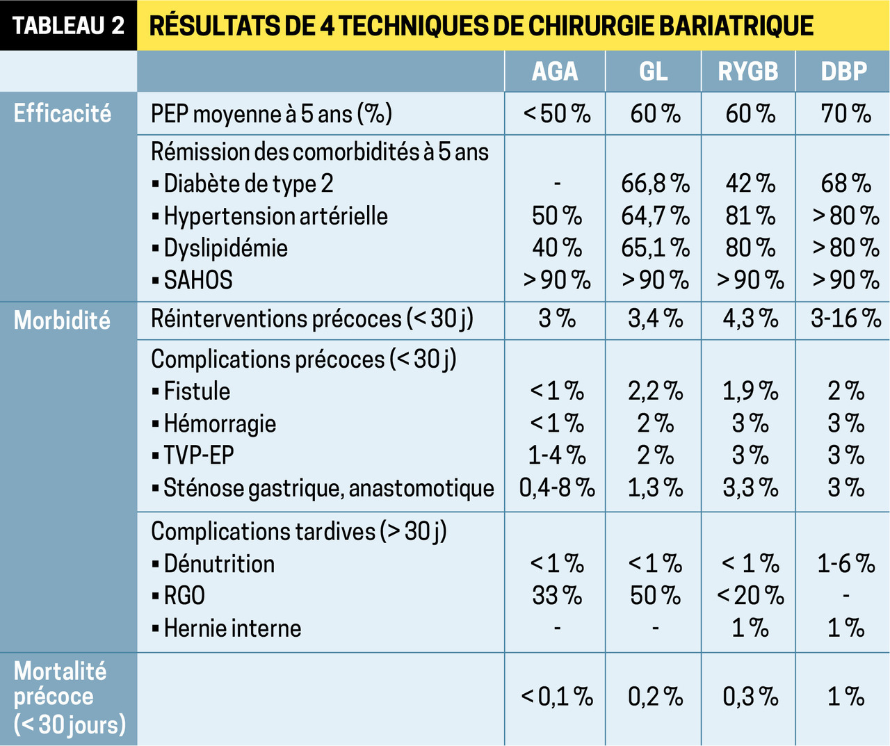 Pour la GL, intervention la plus récente, la majorité des études rapportent une perte d’excès de poids (PEP) > 50 % au-delà de 5 ans, qui se maintiendrait (mais peu de données au-delà de 10 ans). Le RYGB permet d’obtenir une PEP > 50 %, homogène et durable au-delà de 10 ans et un contrôle des différentes comorbidités.