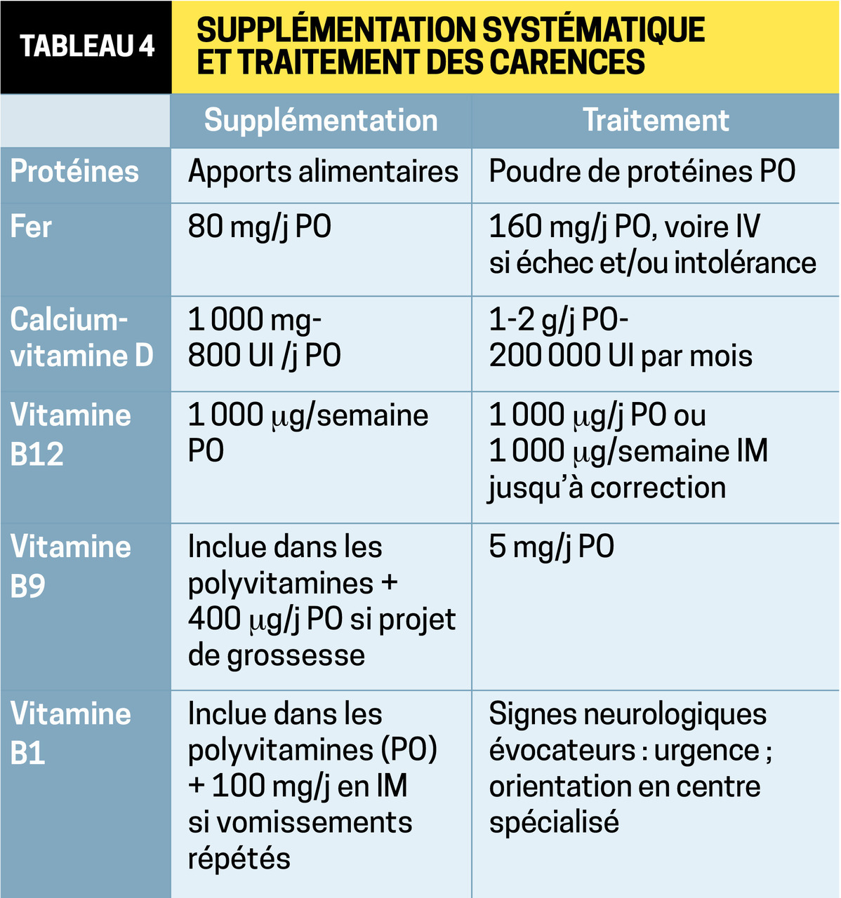 Durant la période de perte pondérale (12-18 mois), tous les patients opérés sont exposés au risque de carences, justifiant une supplémentation, indépendamment de la procédure. Elle doit être prolongée au long cours après bypass et DBP (techniques mal- absorptives). En effet, après DBP, 30 à 50 % des patients sous supplémentation et surveillés ont au minimum une carence en macro-/micronutriments. Des signes fonctionnels digestifs sont fréquents (v. p. 240), impactant la qualité de vie. Une surveillance biologique régulière est donc nécessaire.