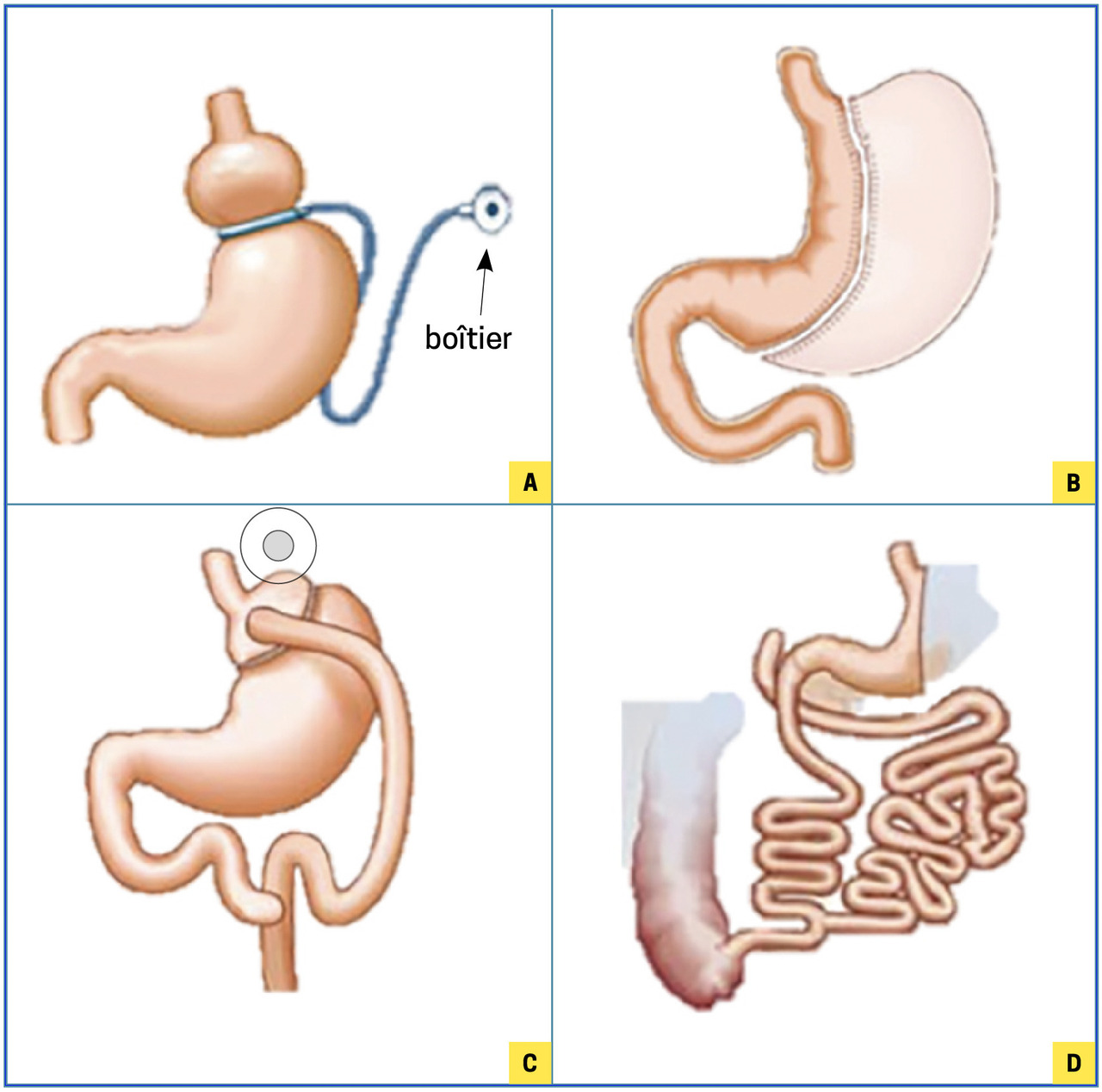 Les indications sont définies par la HAS4 (encadré 1). L’IMC retenu lors de la décision en RCP peut être l’indice actuel ou sa valeur maximale à condition qu’elle soit documentée. Si l’IMC devient inférieur au seuil requis pour envisager la chirurgie (35 kg/m²) grâce à une prise en charge médicale multidisciplinaire, la chirurgie n’est pas contre-indiquée ; cela est même un facteur prédictif de succès. Chez les patients d’origine asiatique, les seuils d’IMC sont réduits de 2,5 points. Il n’y a pas de limite d’âge, mais les bénéfices et les risques chez les plus de 60 ans doivent être discutés et l’indication opératoire posée au cas par cas en fonction du niveau d’activité physique et des antécédents. Les indications pédiatriques, très limitées, ne sont pas abordées ici.