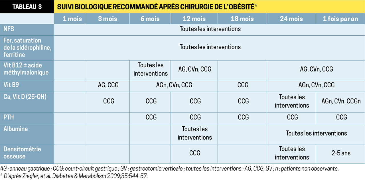 Idéalement, les patients devraient être suivis tous les 3 mois pendant les 2 premières années, puis annuellement jusqu’à la 5e année postopératoire par l’équipe qui les a pris en charge (incluant le médecin traitant). But : surveiller la cinétique de la perte de poids, prévenir les carences et les traiter, adapter la posologie des traitements en cours, et éviter la reprise pondérale.