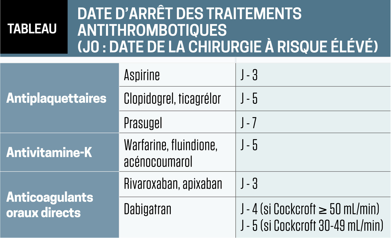 Dernière prise à J - 3 pour rivaroxaban, apixaban. À J - 4 pour dabigatran si clairance de la créatinine ≥ 50 mL/min et J - 5 si clairance entre 30 et 50 (tableau ).