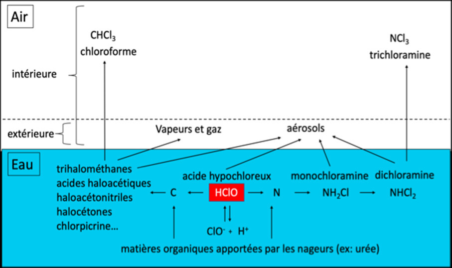 La France est le pays de l’Union européenne qui compte le plus grand nombre de piscines privées (> 3 millions) et publiques (> 4 000). Biocide peu coûteux et très efficace, le chlore est utilisé pour désinfecter l’eau en prévention des risques infectieux. Ajouté sous forme de gaz dichlore, d’hypochlorite de soude ou de calcium ou de chloro-isocyanurates, il libère de l’hypochlorite et de l’acide hypochloreux dont la somme constitue le chlore libre, l’acide hypochloreux étant le chlore actif capable de détruire les micro-organismes pathogènes (figure).