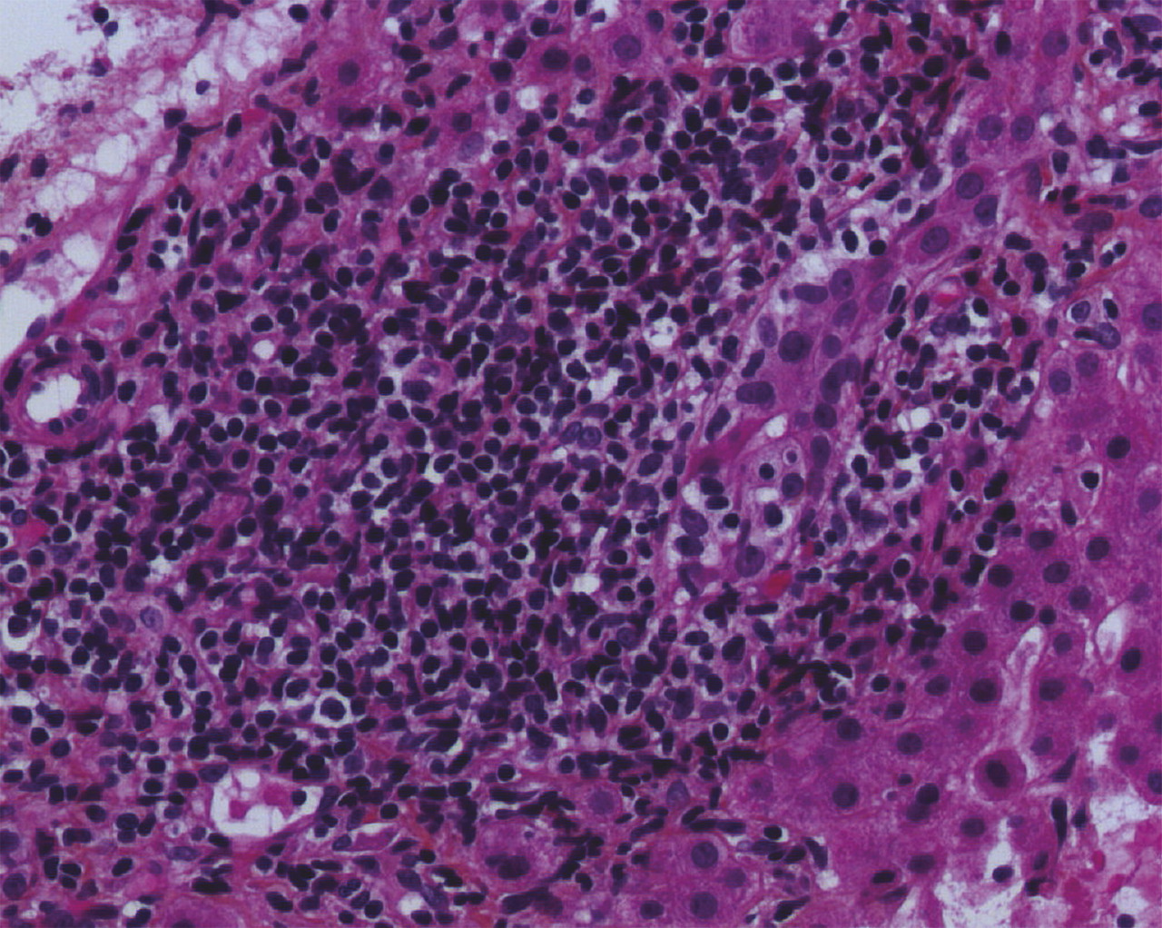Biologiquement, il existe une cholestase chronique, définie par une augmentation concomitante des phosphatases alcalines (PAL) et de la gammaglutamyl transpeptidase (GGT) depuis au moins 6 mois. La cholestase peut être isolée, ou associée à une élévation modérée des transaminases et, plus rarement, à un ictère, qui est un signe de sévérité. Une augmentation des immunoglobulines sériques de type M (IgM) est fréquente. Le marqueur le plus spécifique de la CBP est la présence d’anticorps anti-mitochondrie de type M2 (AAM-2), à un taux sérique supérieur ou égal à 1/40e, présents chez plus de 95 % des patients atteints de CBP. Quand la biopsie hépatique est réalisée, on peut parfois observer des lésions de cholangite destructrice lymphocytaire ou granulomateuse, associées à un infiltrat portal et périportal lympho-plasmocytaire, éventuellement organisé en granulome, et parfois à une ductopénie (perte des canaux biliaires dans plus de 50 % des espaces portes) et à une fibrose (fig. 1 ).