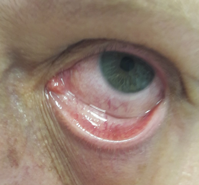 L’examen ophtalmologique est normal (vitré clair, pas d’hypertension intraoculaire, pôles antérieur et postérieur sans particularités), hormis une épisclérite associée à un chémosis inflammatoire en inférieur (