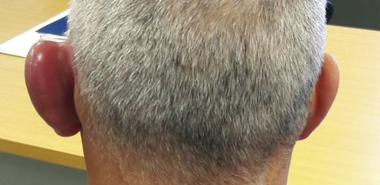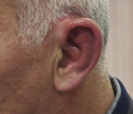 Un homme de 53 ans consulte pour une otalgie gauche associée à un décollement du pavillon de l’oreille depuis quarante-huit heures (