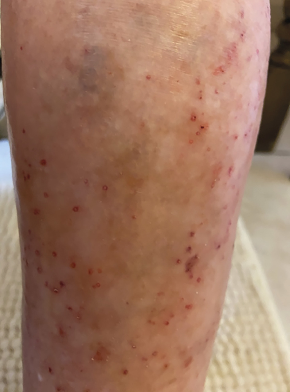 Elle ne prend ni antiagrégants ni anticoagulants. À l’examen, les lésions purpuriques bilatérales, non prurigineuses, sont accompagnées de quelques ecchymoses et d’œdèmes modérés des membres inférieurs.