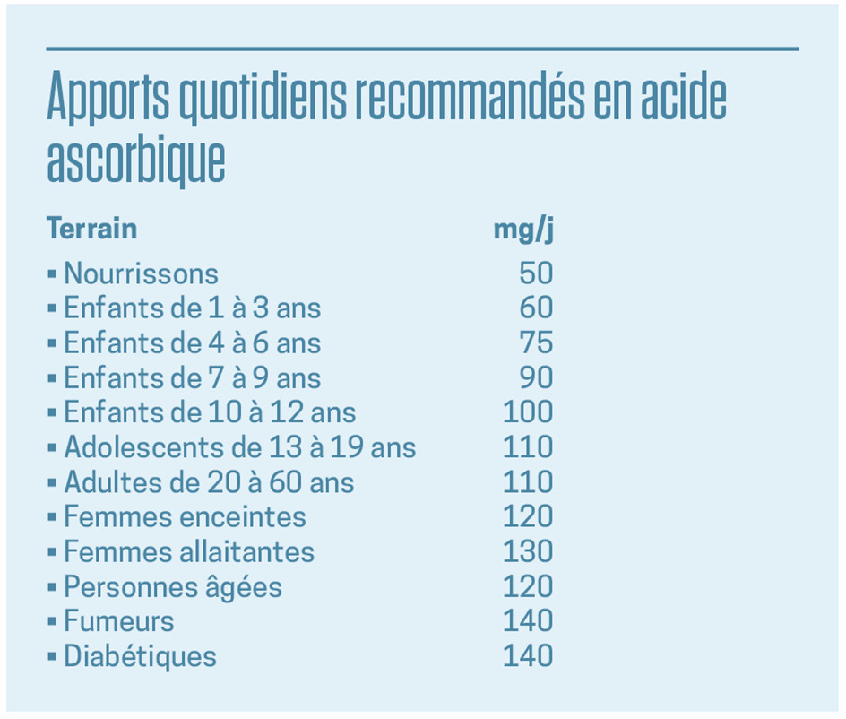 Les apports en vitamine C sont assurés par une alimentation riche en fruits et légumes. Au quotidien, on recommande un minimum de 110 mg/j chez l’adulte (encadré ). Les besoins sont accrus pendant la croissance, la grossesse, l’allaitement, chez les diabétiques ou en cas de surcharge en fer.