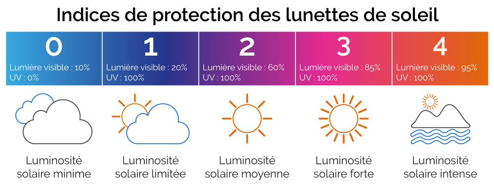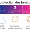 Selon la norme NF EN ISO 12312-1 2013, il existe cinq catégories de lunettes de soleil pour usage général, selon un pourcentage croissant de lumière filtrée (chacune représentée par un pictogramme spécifique, figure) :