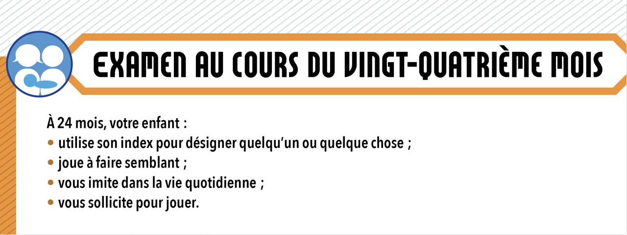 Les nouveaux carnets de santé (fig. 1 ) rappellent aux parents qu’à 24 mois l’enfant utilise son index pour désigner quelqu’un ou quelque chose, joue à faire semblant, les imite dans la vie quotidienne, les sollicite pour jouer.