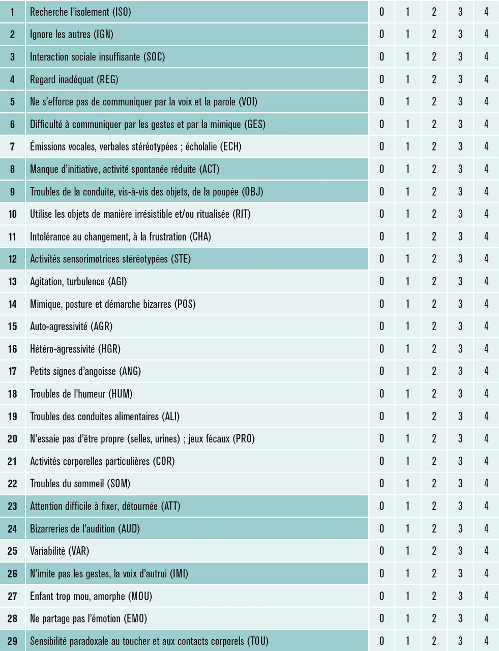 La confirmation diagnostique est clinique. L’observation, en situation d’interaction avec l’enfant, de ses capacités de communication sociale et de ses comportements restreints répétitifs afin de rechercher les signes centraux de trouble autistique en référence aux critères de la version 5 du Manuel diagnostique et statistique de troubles mentaux (DSM-5). Des outils standardisés tels que la Childhood Autism Rating Scale (CARS), l’Autism Diagnostic Observation Schedule (ADOS) ou l’ECA-R (échelle d’évaluation des comportements autistiques révisée)4 [fig. 2 ] sont des aides au diagnostic. À cette observation s’associent les éléments du bilan de développement préalablement réalisé et complété en fonction des éléments de l’anamnèse. L’examen psychologique du niveau de fonctionnement intellectuel et des capacités adaptatives de l’enfant dans les situations de vie quotidienne sur la base des observations parentales permet de cerner les potentialités et les difficultés indispensables pour construire le projet personnalisé d’intervention.