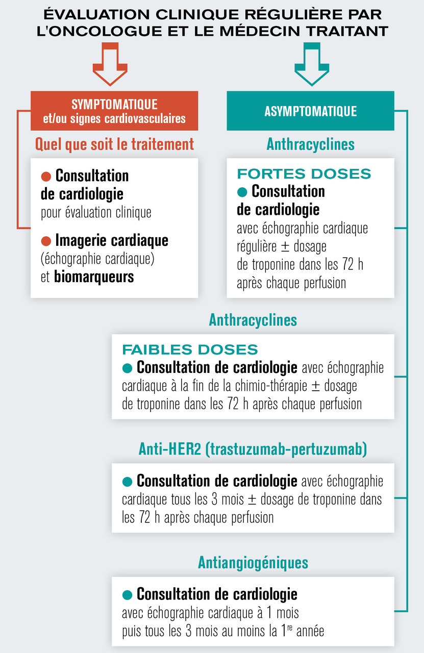 Une évaluation cardiovasculaire doit être faite avant le traitement puis poursuivie dans le programme de soins de tous les patients cancéreux considérés à risque d’événements cardiovasculaires. Ce risque est estimé en fonction de la thérapeutique anticancéreuse envisagée et des antécédents cardiovasculaires. Le suivi cardiovasculaire est alors effectué en parallèle du suivi oncologique lors de consultations de cardio-oncologie incluant au moins un examen clinique complet, un électrocardiogramme et une imagerie cardiaque. Cette prise en charge interdisciplinaire a pour objectif de limiter l’impact péjoratif des effets indésirables cardiovasculaires des traitements oncologiques sur le pronostic global des patients.