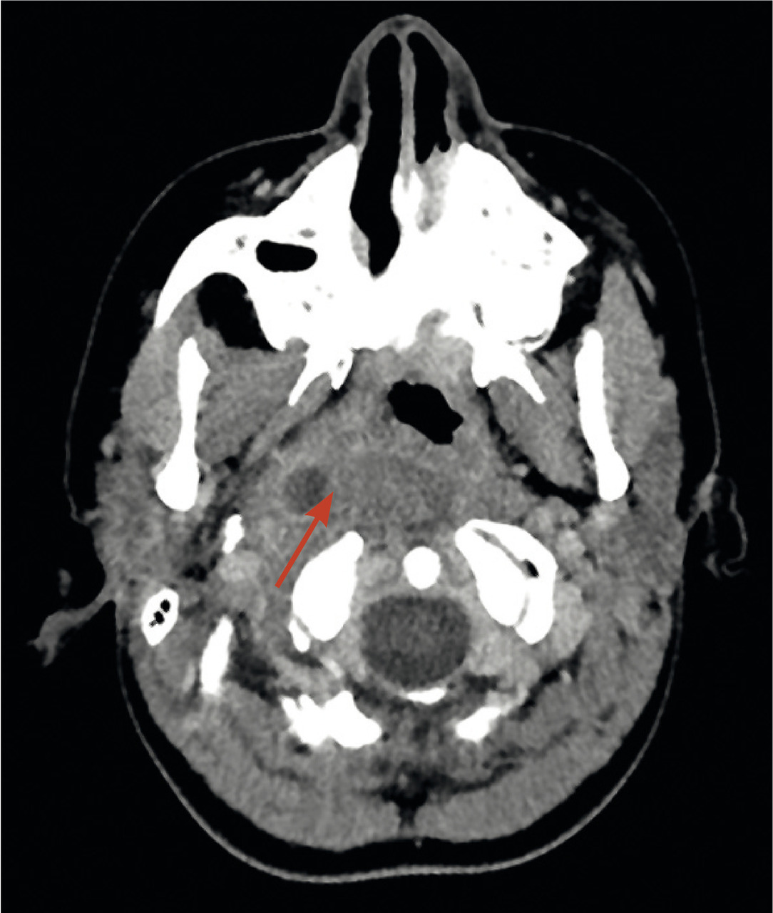Ils compliquent les rhinopharyngites ou angines de l’enfant de moins de 7 ans. En cause : staphylocoque, streptocoque, anaérobies (comme dans le phlegmon).3 Très évocateurs : un torticolis avec hyperthermie et grande altération de l’état général. On palpe un empâtement cervical et souvent plusieurs adénomégalies. Le bombement latéral du pharynx est inconstant. Le scanner injecté confirme le diagnostic, localise la collection et d’éventuelles complications (fig. 2). L’intervention urgente consiste en une antibiothérapie IV associée ou pas au drainage chirurgical.