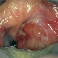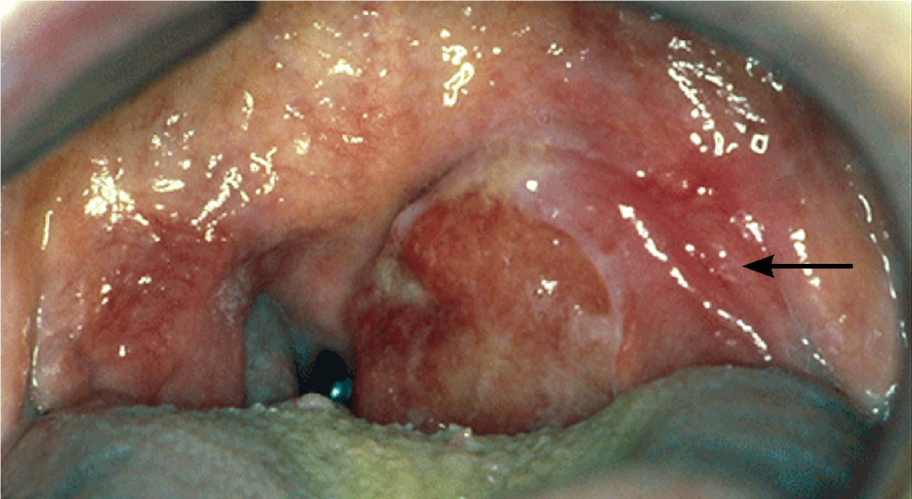 Rendu difficile par le trismus, l’examen endobuccal met en évidence une voussure unilatérale du pilier antérieur, associée à un œdème et un refoulement controlatéral de la luette (fig. 1).