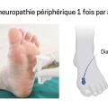 La neuropathie diabétique est secondaire à une atteinte mixte neurovasculaire : dégénérescence axonale et lésions ischémiques. La polynévrite axonale ascendante est l’atteinte la plus fréquente. L’atteinte sensitive précède l’atteinte motrice. Elle touche, de façon bilatérale et symétrique, les extrémités des membres inférieurs (puis supérieurs) et évolue de façon ascendante, vers les racines. Si elle est souvent asymptomatique au début, un déficit de sensibilité doit être recherché (hypopallesthésie, trouble proprioceptif, non-perception du monofilament [fig. 2]), ainsi qu’une aréflexie ostéotendineuse et des paresthésies. Le déficit moteur est tardif. La polynévrite axonale ascendante peut aboutir à des déformations de la voûte plantaire, à des orteils en griffes, à une neuro-arthropathie diabétique sévère (pied de Charcot). Le pronostic est dominé par le risque de mal perforant plantaire et d’amputation.