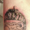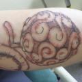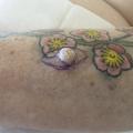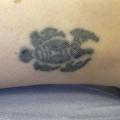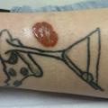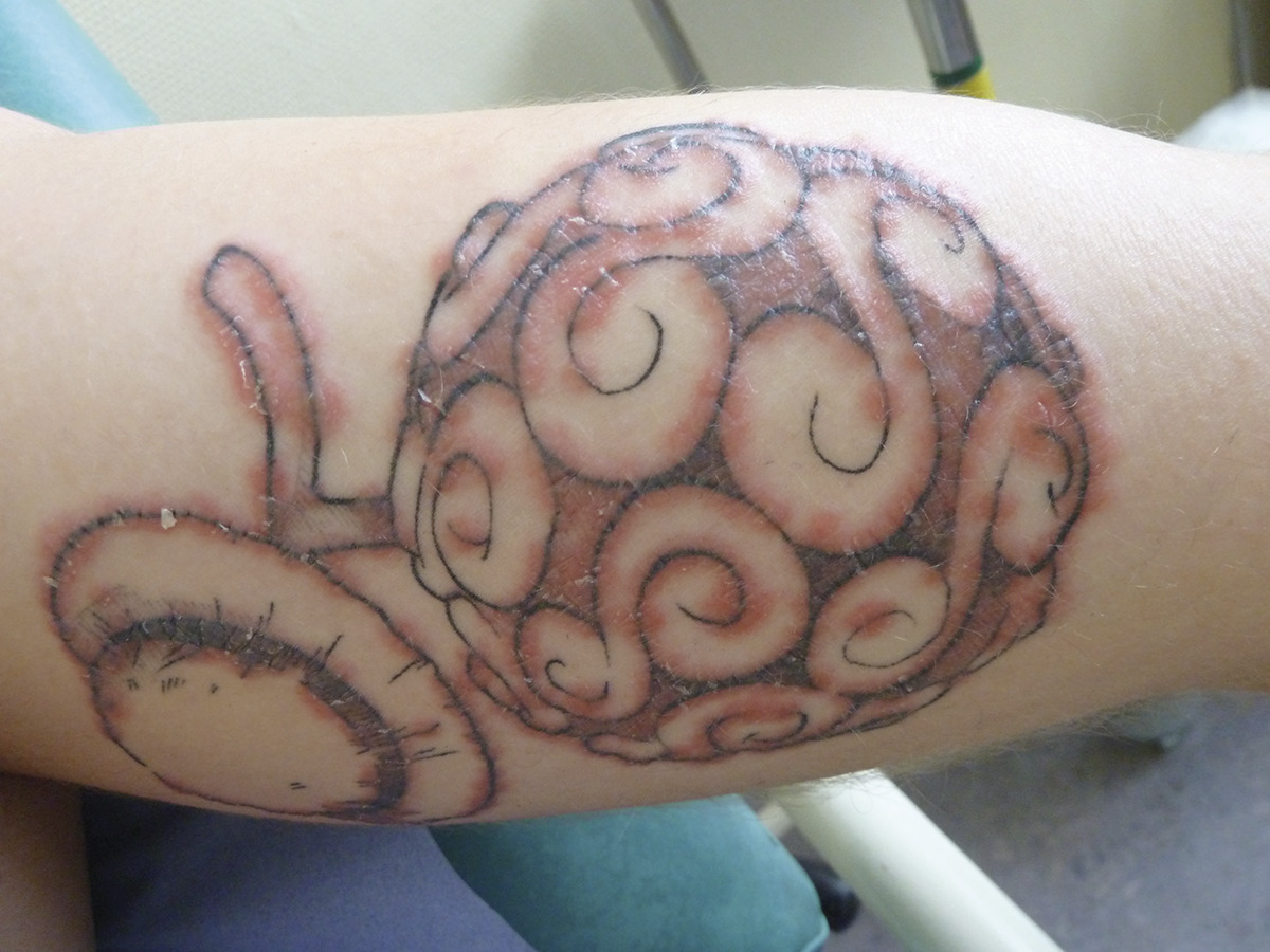 – une diffusion de la couleur (tattoo blowout) dans l’hypoderme ; elle peut être observée en cas de tatouage sur zones de peau claire et fine (face interne des bras, des avant-bras et dos du pied) et se présente sous la forme d’un halo flou bleuâtre ou noir inesthétique autour du tatouage. Il est pris initialement par le client pour un hématome, mais ce dernier ne se résorbe pas. Le traitement repose sur un détatouage laser de la zone.3