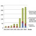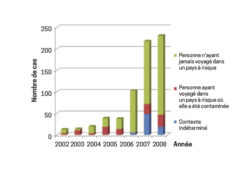 En Europe, le nombre annuel de cas répertoriés est passé de 514 en 2005 à 5 617 en 2015 ; cette augmentation est très nette en France (fig. 1 ).