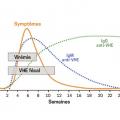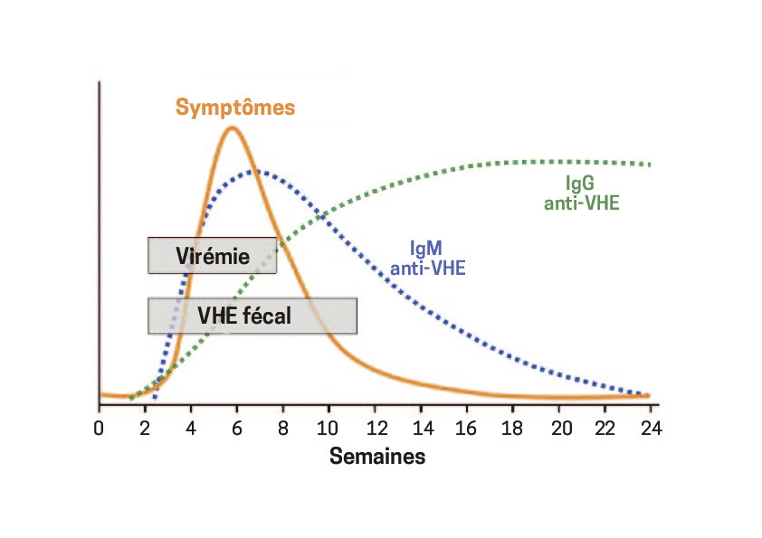 Sur le plan clinique, le diagnostic différentiel des hépatites est difficile. Le contexte (milieu tropical, autres cas dans l’entourage, grossesse) peut orienter. La confirmation repose sur les examens biologiques. Une élévation des transaminases (ALAT > 2 000 UI/mL) est observée dès le début de l’infestation. La virémie étant positive quelques jours avant les signes cliniques et durant 3-4 semaines, la RT-PCR peut détecter l’ARN viral pendant cette période. De même, le virus est éliminé dans les selles 8 jours avant l’ictère et y est retrouvé pendant 1 mois. Par ailleurs, les IgG et les IgM anti-VHE apparaissent pendant le premier mois ; puis les IgM disparaissent en 6 mois et les IgG en plusieurs années (fig. 2 ).6 L’identification et le typage sont réalisés par le Centre national de référence de l’hépatite E (laboratoire de virologie, institut fédératif de biologie, Pr Jacques Izopet, Toulouse).