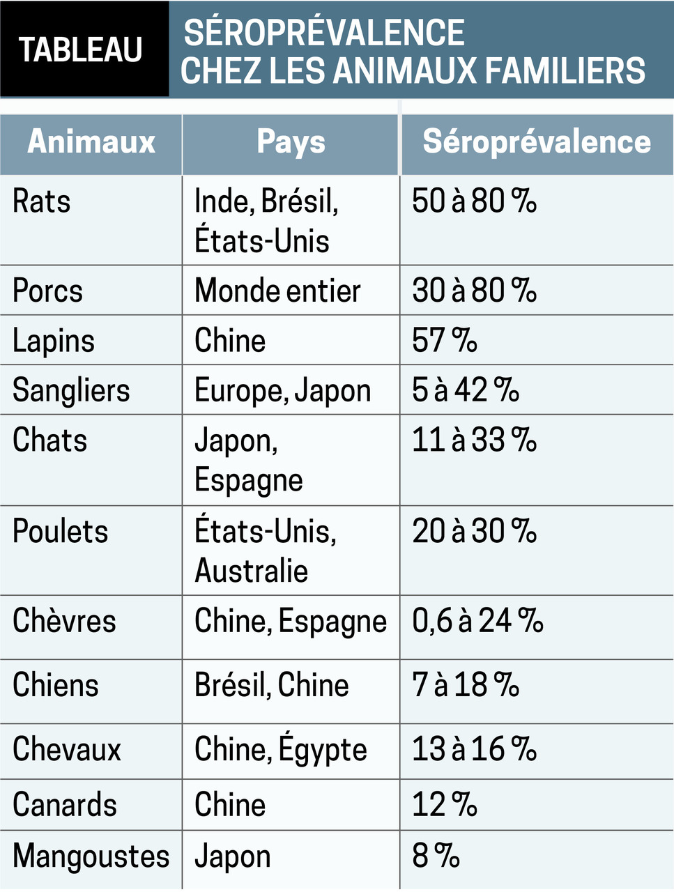 Quatre génotypes majeurs sont décrits,1 dont la répartition géographique est différente (encadré ). Les génotypes 1 (avec 5 sous-types) et 2 (2 sous-types), strictement humains, sont endémiques dans les zones tropicales, en raison des mauvaises conditions d’assainissement de l’eau et sont responsables d’épidémies. Les génotypes 3 (10 sous-types) et 4 infectent différentes espèces animales – surtout porcs et sangliers, mais aussi bovins, daims, lapins, poulets, rats – dans les pays tempérés2 (tableau ) et plus rarement l’homme (en particulier les sujets travaillant dans la filière porcine).3 Les génotypes 5 et 6 sont retrouvés chez les sangliers, et le 7 chez les chameaux.
