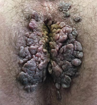 Une femme de 23 ans consulte pour des excroissances prurigineuses en « crêtes de coq » de la marge anale (fig. 1).