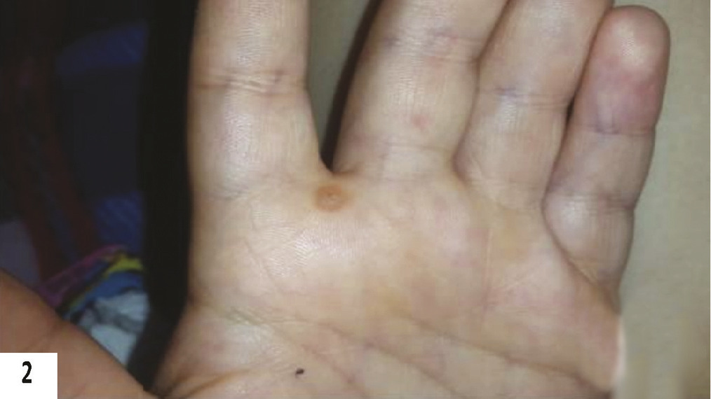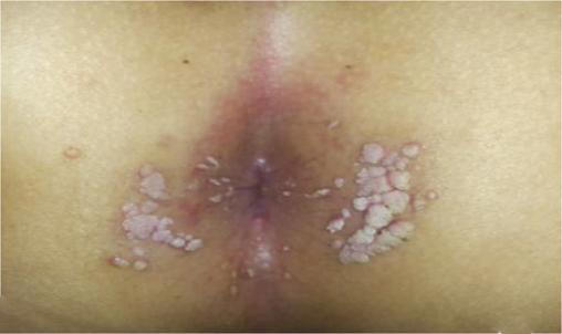 Ce jeune garçon de 7 ans, vivant avec ses parents et ses deux sœurs, consultait pour des lésions périanales évoluant depuis 6 mois… Il avait comme antécédent un syndrome néphrotique sur néphropathie lupique, sous corticothérapie à forte dose (1 mg/kg/j) depuis plus d’un an. À l’examen, on notait de multiples lésions érythémateuses, verruqueuses en crête de coq périanales (fig. 1) ; mais ni cicatrices anciennes, ni ecchymoses, griffures, hématome ou fissure anale ; le tonus sphinctérien était bon. On notait la présence d’une papule ronde, bien limitée, à bord net, à surface rugueuse, de 4 mm de diamètre, siégeant au niveau palmaire gauche (fig. 2), évoluant depuis 2 ans. L’interrogatoire minutieux de l’enfant et de la maman ne trouvait pas de notion d’abus sexuel. Les sérologies virales des hépatites B et C, du VIH et le TPHA/VDRL étaient négatives. L’examen à l’anuscope ne trouvait pas de lésions internes. Devant le terrain d’immunodépression, l’absence de signes en faveur d’un abus sexuel et la présence d’une verrue palmaire précédant l’apparition des lésions périanales, le diagnostic de condylomes acuminés auto-inoculés était retenu.