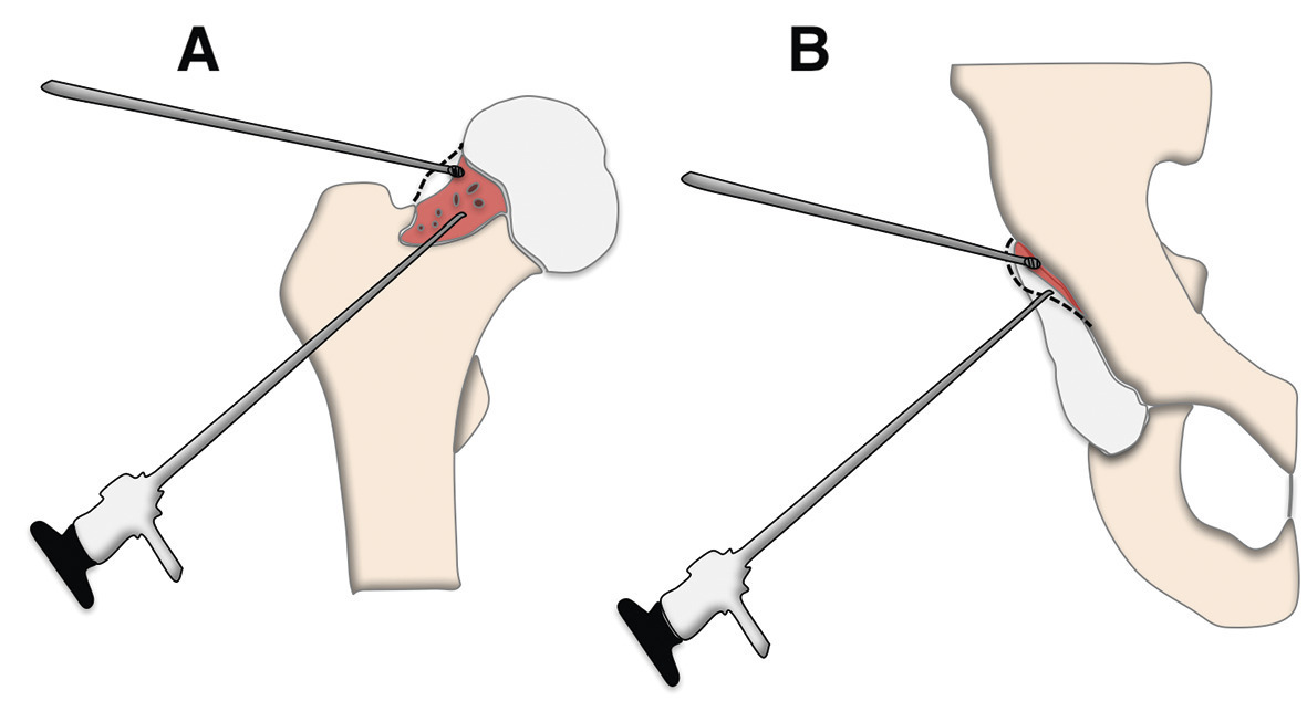 Si les douleurs persistent malgré un traitement médical bien conduit, l’intervention chirurgicale soulage les patients en corrigeant les vices architecturaux. Sous arthroscopie, en ambulatoire, elle consiste à réséquer la « bosse » du col fémoral et à fraiser le toit du cotyle s’il est trop couvrant (fig. 4). Les lésions du labrum et du cartilage sont traitées dans le même temps (suture du labrum ou résection, résection des clapets cartilagineux, microfractures, greffe des zones dépourvues de cartilage, etc.). L’appui est autorisé d’emblée en postopératoire, éventuellement avec des cannes-béquilles pendant 15 jours. Un AINS évite la formation de calcifications. La kinésithérapie entretient les amplitudes articulaires afin d’éviter des adhérences responsables de raideur articulaire.
