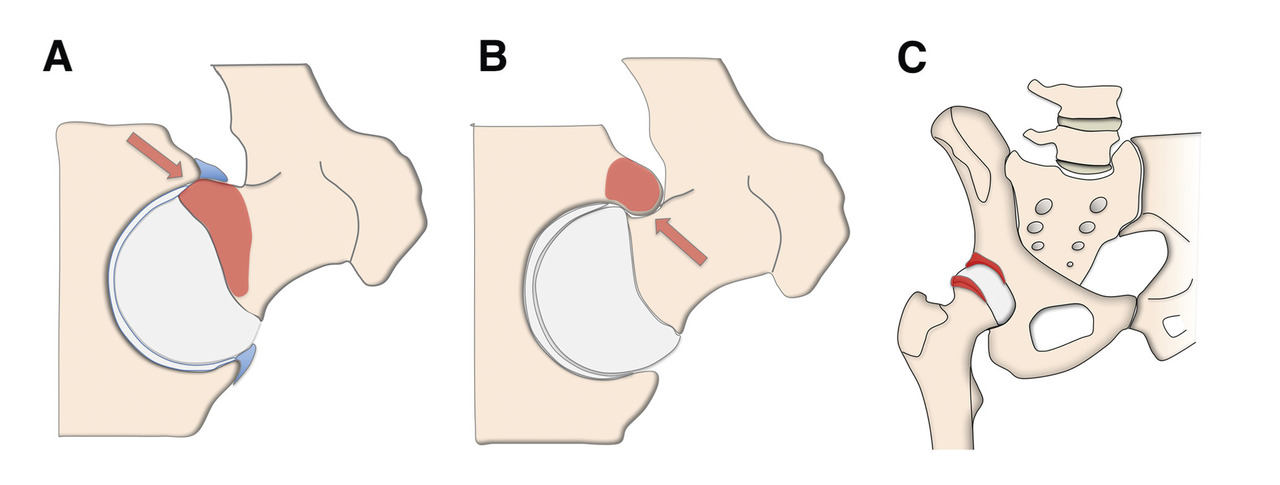 Des pathologies articulaires de hanche pourraient en être responsables : séquelles d’épiphysiolyse, d’ostéochondrite ou de traumatismes pour l’effet came ; coxa profonda, rétroversion acétabulaire, inclinaison pelvienne antérieure trop importante pour l’effet tenaille.
