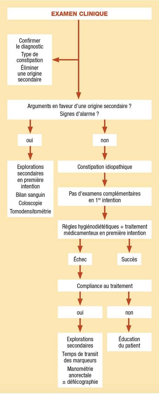 En cas de constipation idiopathique, en l’absence de signes d’alarme, un traitement médical est instauré en première intention, avant la réalisation d’examens complémentaires :