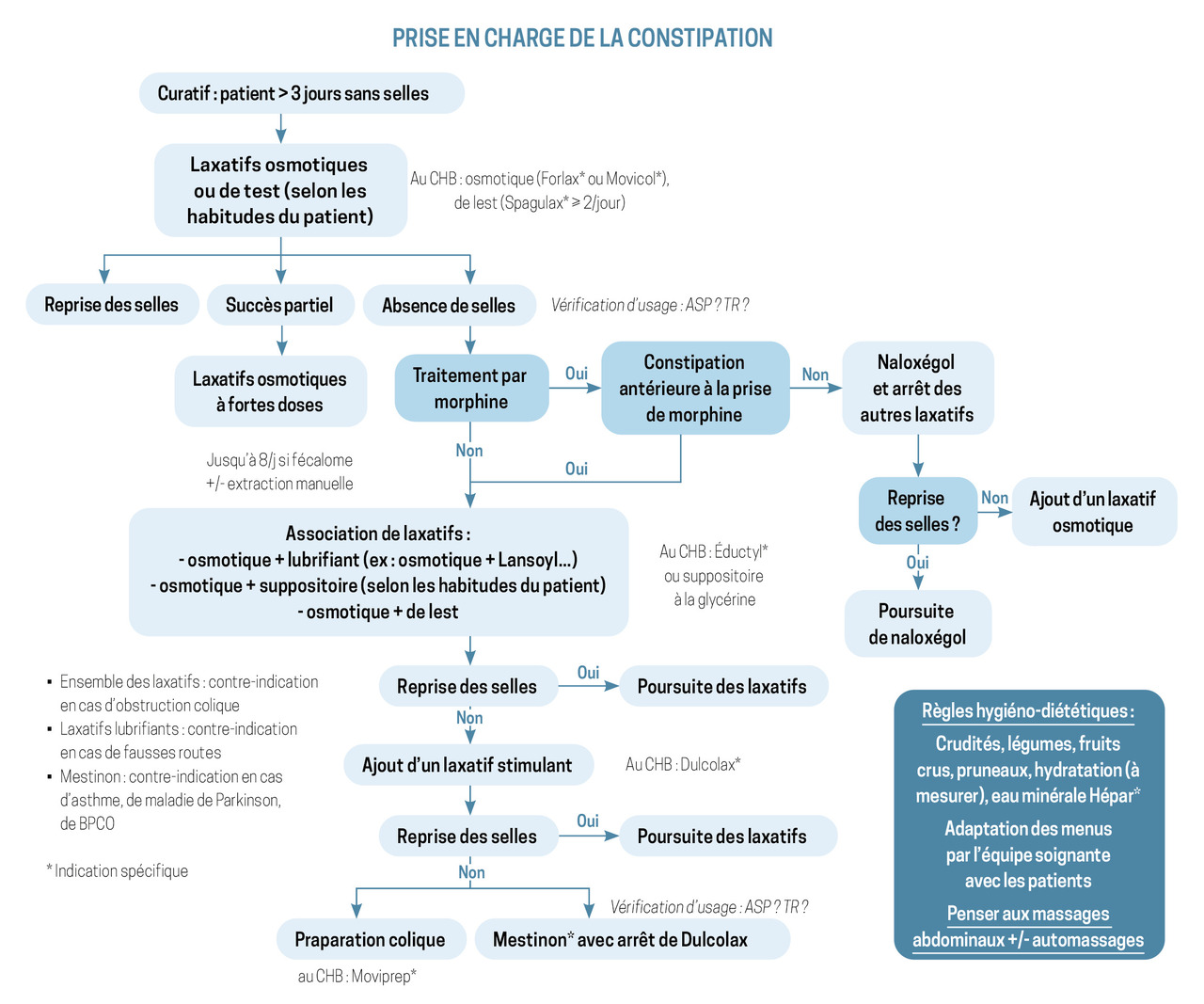 Le traitement curatif repose sur les mêmes principes que le traitement préventif : le respect des règles hygiénodiététiques est toujours préconisé. En première intention, les laxatifs osmotiques ou de lest y sont associés. En l’absence d’efficacité, une intensification du traitement est préconisée (augmentation de la posologie, association de différentes classes de laxatifs…). Le logigramme, établi à la suite de l’EPP réalisée au sein de notre établissement et tenant compte des recommandations en vigueur, peut constituer une stratégie thérapeutique à adopter (figure).
