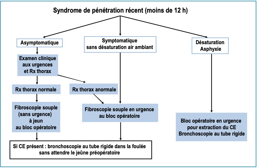 Si l’enfant arrive aux urgences cyanosé, la conscience altérée, et que les parents décrivent un syndrome de pénétration, il faut le conduire d’emblée au bloc opératoire ou en salle de déchocage (fig. 1 ). Si un CE sus-laryngé ou sous-glottique est visible à l’exposition de la glotte, il est retiré avec une pince de Magill. Dans le cas contraire, il faut intuber l’enfant et le ventiler. En effet, la sonde refoule vers la carène (plus large que la trachée) un ce trachéal et facilite l’oxygénation. En cas de localisation bronchique, l’apport supplémentaire d’oxygène permet d’attendre quelques minutes, afin d’organiser la bronchoscopie sous anesthésie générale.