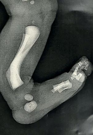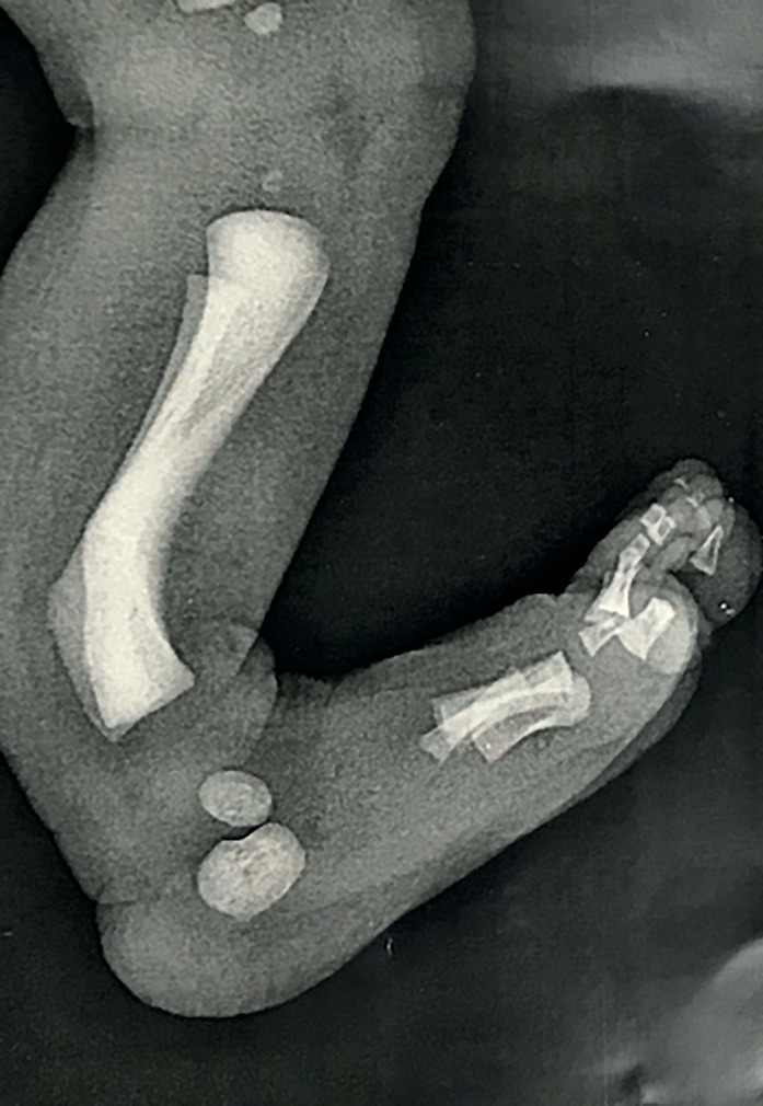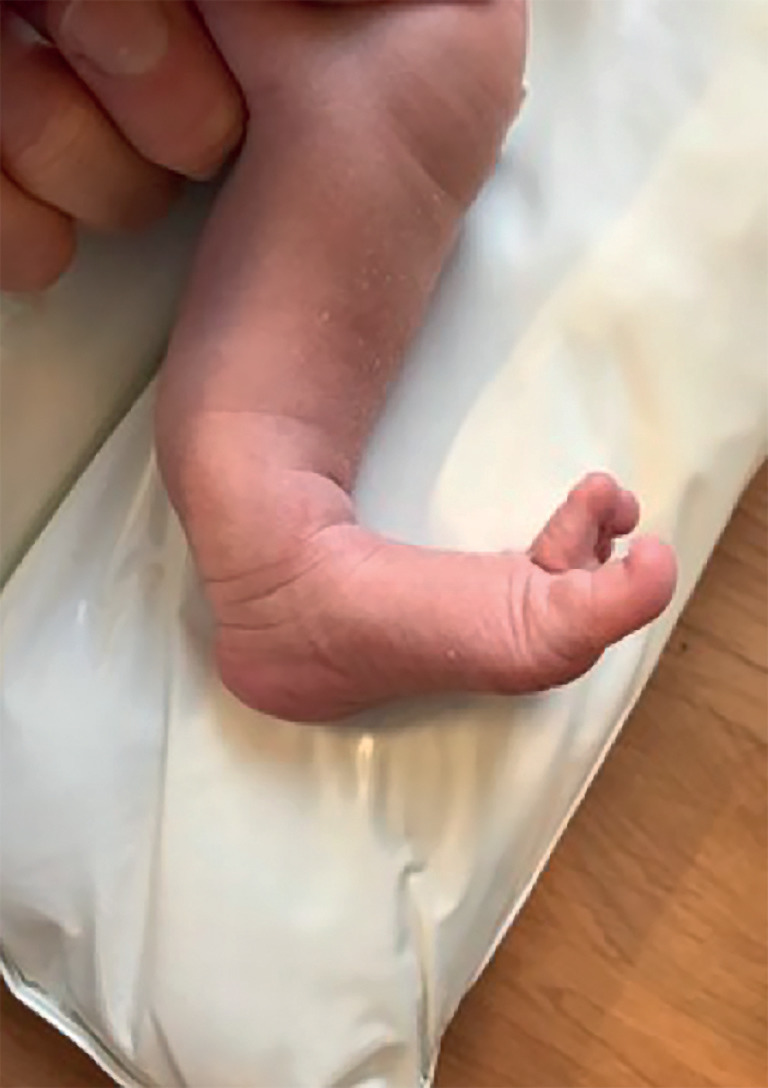 Chez ce bébé, on observe une courbure à concavité antérieure et à convexité postérieure postéro-interne, atteignant les 2 os de jambe, avec un pied strictement normal au plan osseux. Elle est située en dessous d’un genou complet.