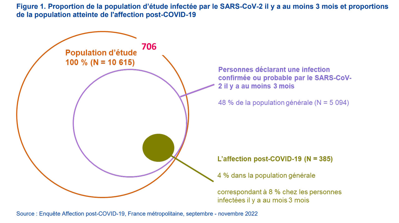 Les résultats de cette étude révèlent que la prévalence du Covid long (selon la définition de l’OMS) parmi les personnes infectées en France est de 8 % (c’est-à-dire que 8 % des personnes ayant eu le Covid il y a au moins 3 mois déclarent des symptômes persistants ne s’expliquant pas par autre chose). On est bien loin de l’estimation de la première étude de SPF au printemps 2022, qui s’élevait à 30 % ! Parmi les 8 % de personnes souffrant de troubles post-Covid, 30,9 % ont été infectées depuis plus de 12 mois, et 22,4 % depuis plus de 18 mois ; 21,3 % ont été infectées lors de la vague du variant delta et 53,2 % lors de la vague omicron.