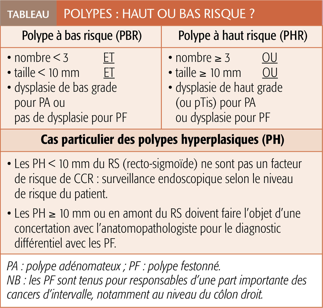 Porter une attention particulière aux recommandations de suivi endoscopique après polypectomie. La HAS distingue 2 groupes de polypes, de haut (PHR) et bas risque (PBR) selon le nombre, la taille des lésions et leurs caractéristiques histologiques (tableau).3