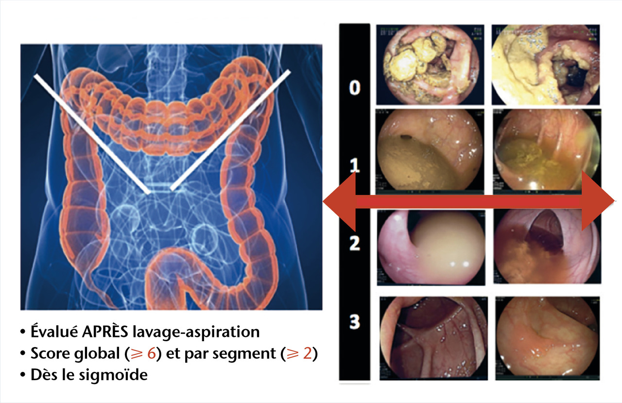 – qualité de la préparation, quantifiée le plus souvent par le score de Boston (de 0 à 9), après lavage-aspiration du côlon. Les coloscopies insuffisamment préparées (score < 7) doivent être reprogrammées ; elles ne doivent pas dépasser 15 % des procédures (fig. 1) ;