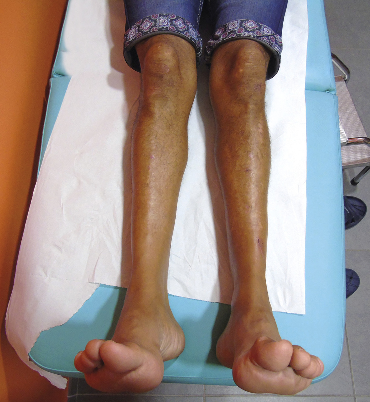 L’examen montre une importante amyotrophie des membres inférieurs associée à des pieds creux.