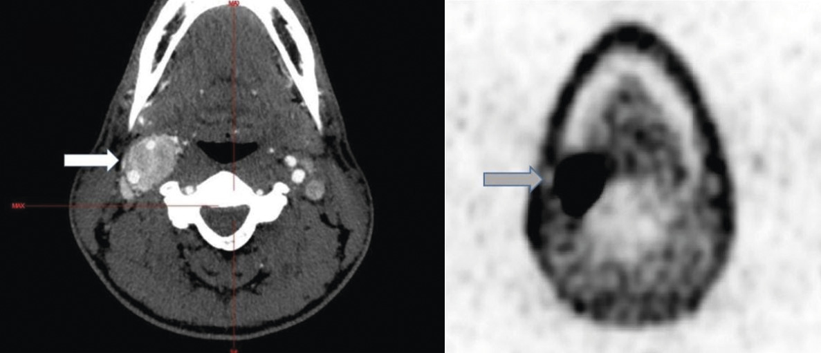 Sur le plan biologique, les dérivés méthoxylés plasmatiques sont normaux (métanéphrine libre plasmatique à 0,17 nmol/L [normale < 0,4] et normétanéphrine libre plasmatique à 0,53 mmol/L [normale < 1,1]). Sur le scanner thoraco-abdomino-pelvien, aucune anomalie n’est décelée, notamment ni lésion hypervasculaire ni atteinte des glandes surrénales. L’imagerie par résonance magnétique (IRM) et l’angio-IRM cervicales objectivent un paragangliome carotidien droit unique de 39 × 23 mm. En TEP-scan à la DOPA, un hypermétabolisme intense est relevé au sein de la lésion, sans autre foyer de fixation suspect (fig. B).